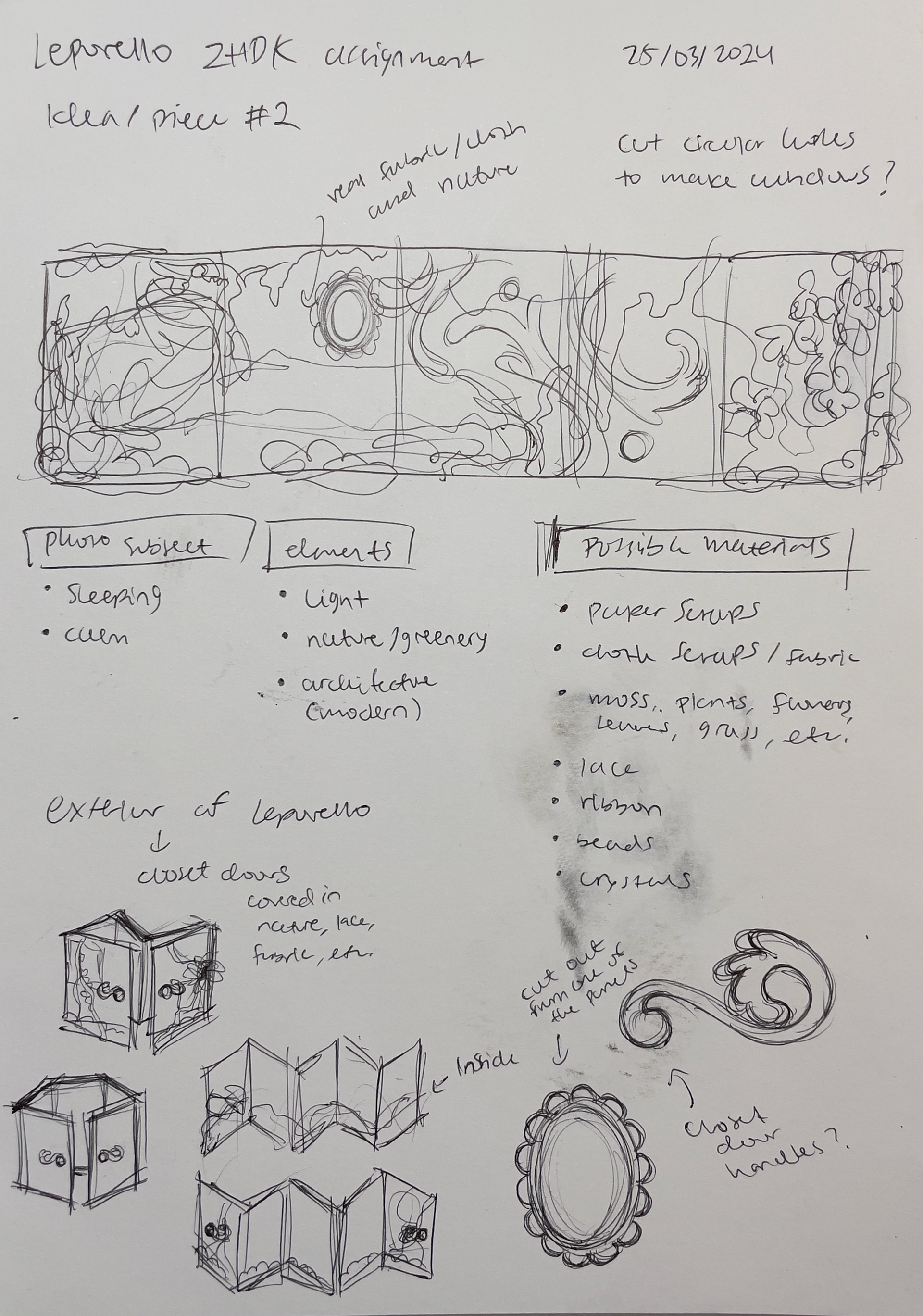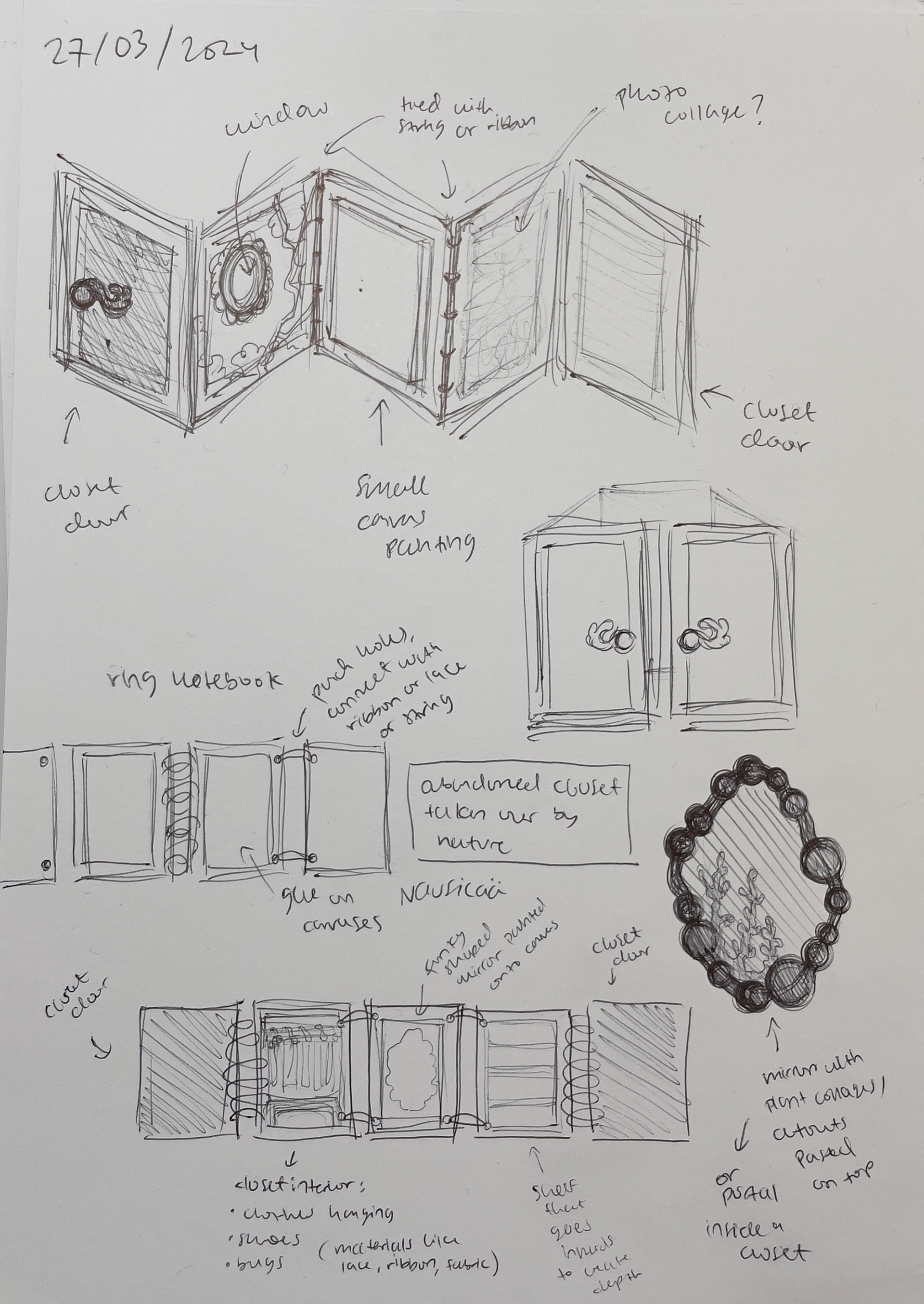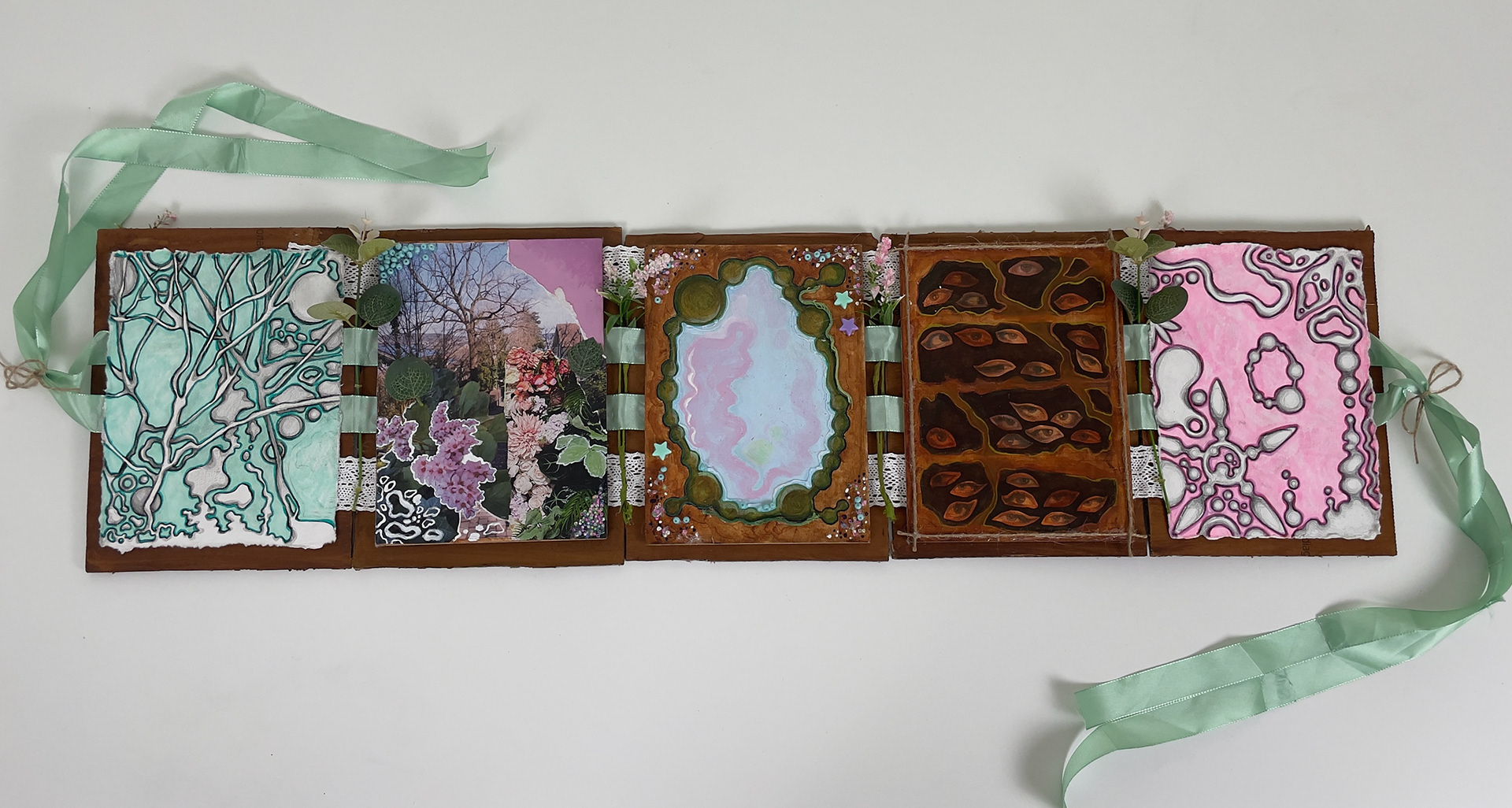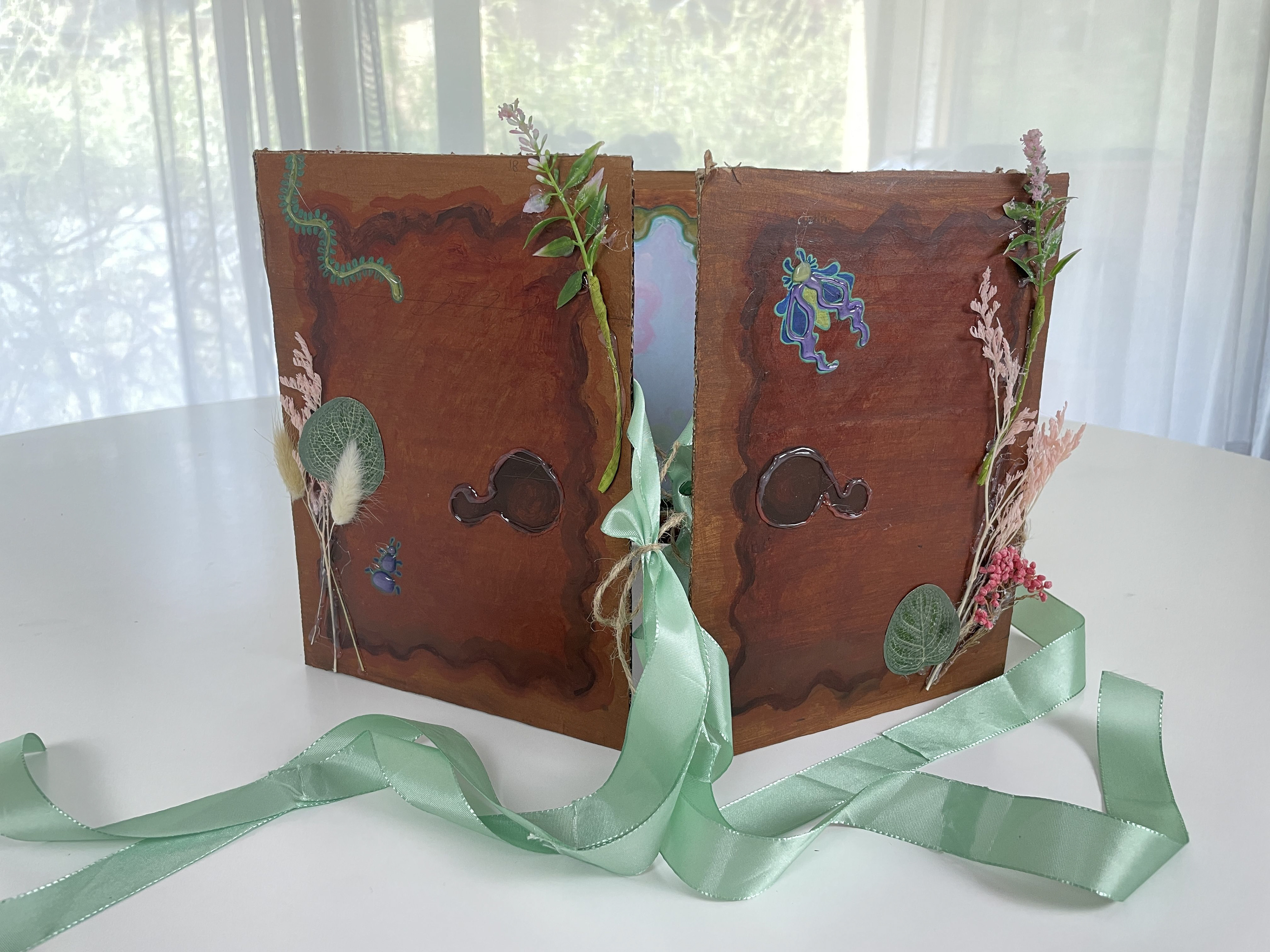 I was tasked to make a Leporello as part of my application for the Preparatory course at ZHDK. I decided to make an abandoned looking closet that looks to be taken over by nature. Materials I used include cardboard, wood canvases, ribbons, fake flora, beads, and paper.